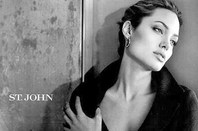 Angelina Jolie pictures classic black and white animals, dog and horse, used in the St. John knits ad campaign. Angelina Jolie is the spokes model of the St. John label.